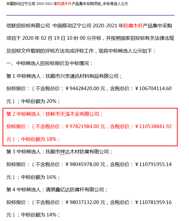 天澤木業(yè)在中國移動遼寧公司最新防腐木桿采購項目中中標